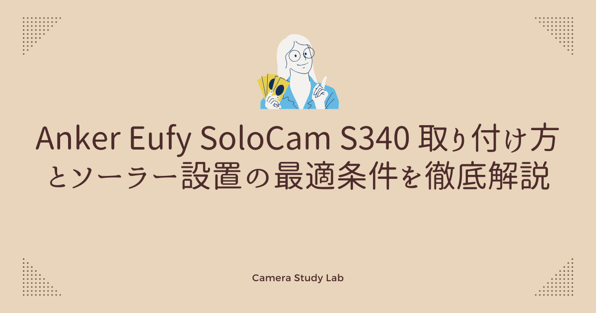 Anker Eufy SoloCam S340 取り付け方を知りたい方に向けて、本記事では製品の特徴や発売日・スペックといった基本情報から、取扱説明書に基づく正しい設置手順、取り付け金具や設置場所の選び方までをわかりやすく解説します。さらに、ソーラーパネル運用や雨樋への設置アイデア、充電ができないときの確認ポイント、ブラケットの活用方法や電源オフ操作、バッテリーライフを長持ちさせるコツなど、実践に役立つ情報も網羅しました。