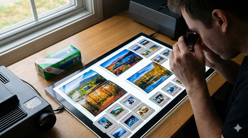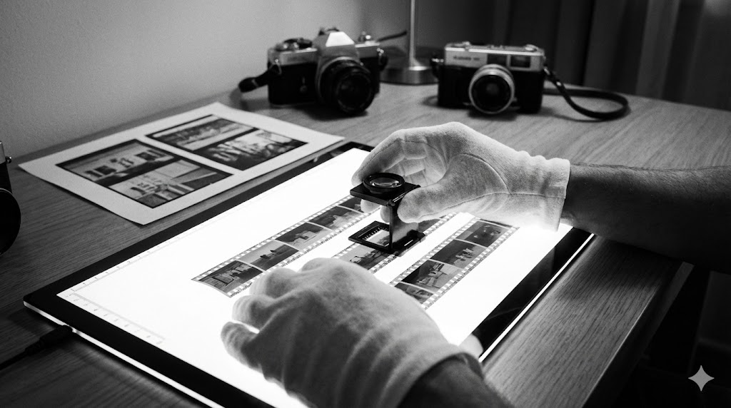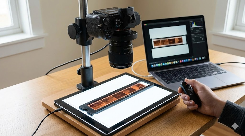 最近かなり増えてきたのが、ミラーレスカメラや一眼レフ+マクロレンズを使った「デジタルカメラスキャン」です。フィルムスキャナーの代わりに、ライトボックス上のネガフィルムをデジタルカメラで撮影してしまう方法ですね。私自身、このスタイルに切り替えてから「処理速度」と「画質の自由度」が一気に上がったと感じています。
