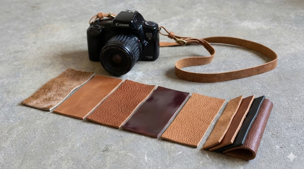 カメラストラップ一眼レフレザーのように高い耐久性が求められるものと、カメラストラップミラーレスレザーのように軽快さが大事なものでは、向いている素材も変わります。ここでは代表的な牛革と、高級素材、そして国内外ブランドが好んで使うレザーの特徴を見ていきましょう。