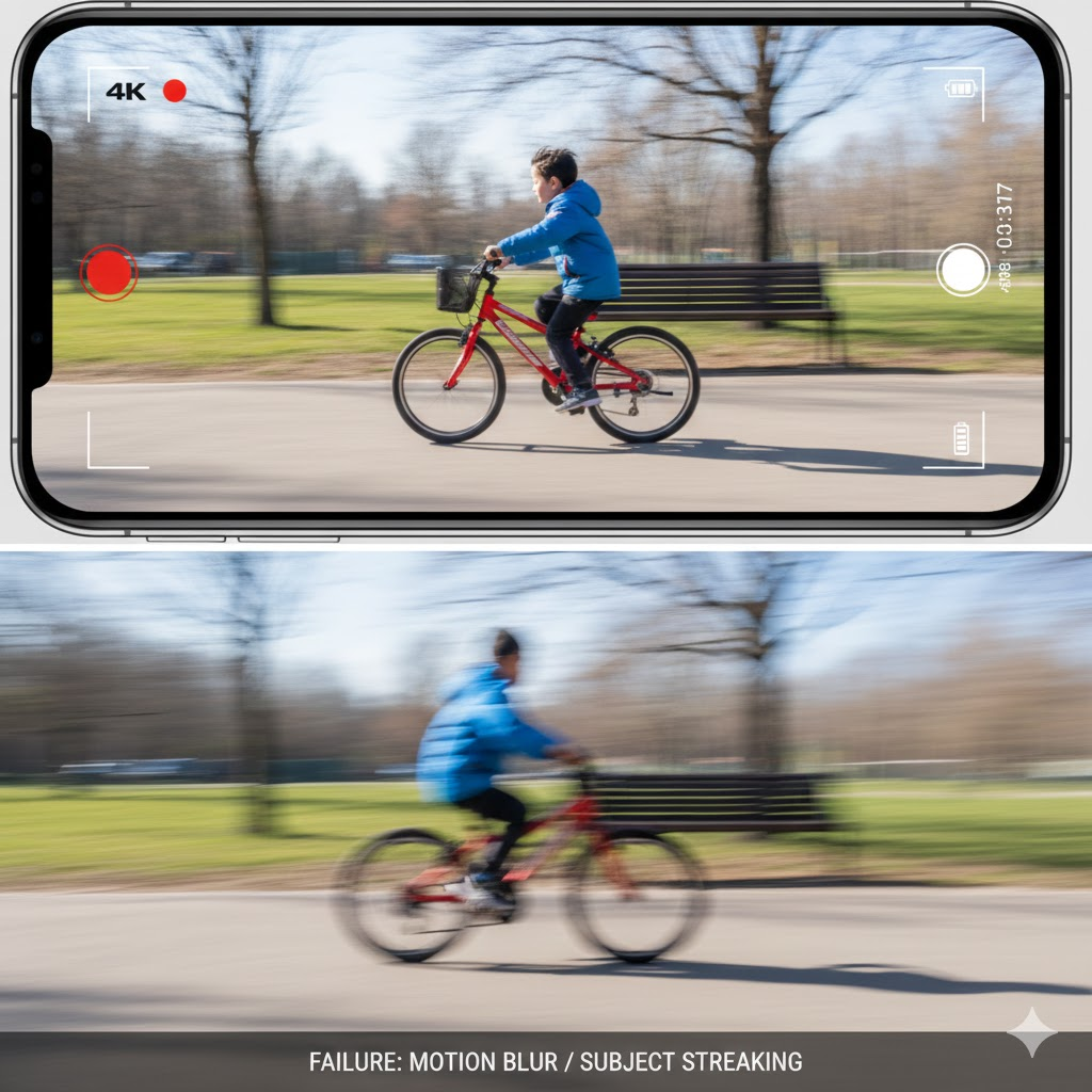 まず一番多いのは、シャッタースピードが遅すぎて、動きがブレたまま静止画として切り出されているパターンです。動画の世界では「自然な動き」に見せるために、30fpsなら1/60秒、60fpsなら1/120秒あたりが推奨されることが多いのですが、静止画としてはかなり遅めのシャッタースピードです。走っている子どもやスポーツの動きなら、1/250秒でもブレが見えることがあるので、1/60秒前後だとどうしても足りないケースが出てきます。