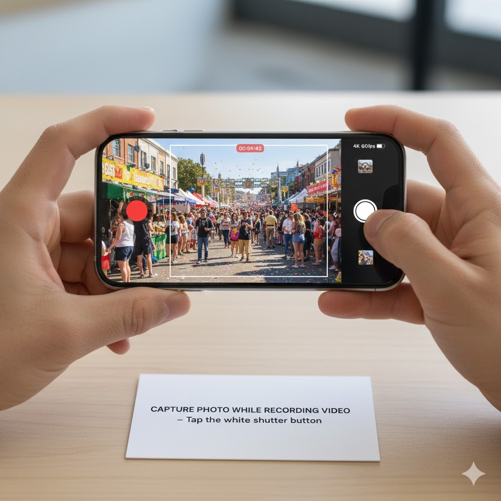 一番身近なのは、やはりスマホのカメラアプリで動画撮りながら写真を使う方法です。iPhoneの場合、ビデオモードで録画を始めると、録画ボタンとは別に白いシャッターボタンが表示されます。このボタンをタップすると、動画撮影を止めずに静止画が保存されます。正直、「とりあえず撮っておく」という意味ではこれが一番手軽です。