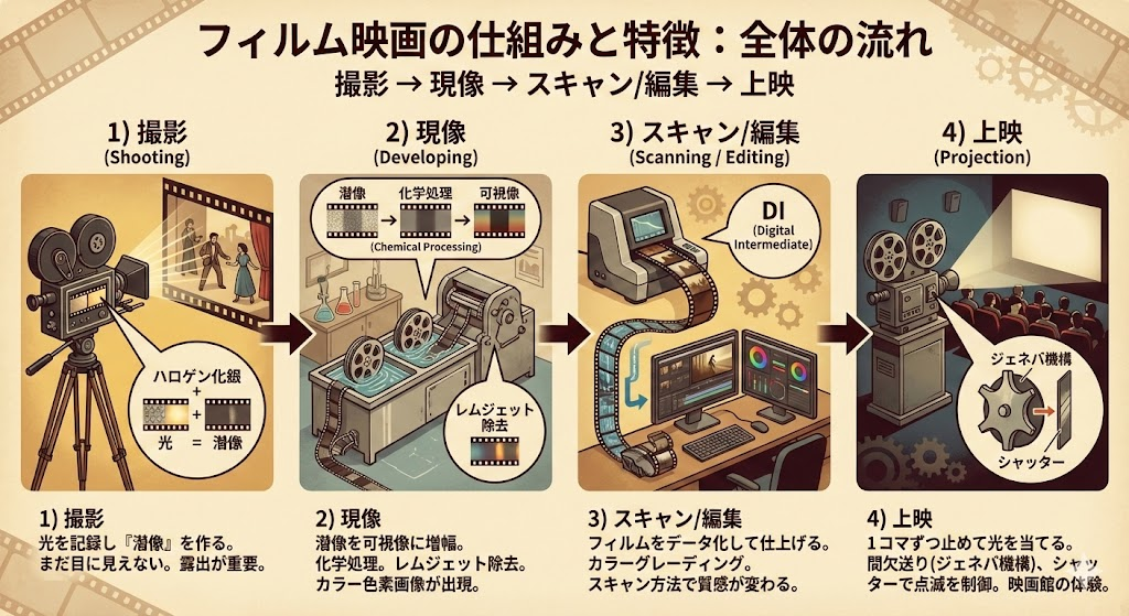 撮影で潜像を作り、現像で像を立ち上げ、スキャン/編集で仕上げ、上映で1コマずつ見せる――これがフィルム映画の仕組みと特徴の全体像です。