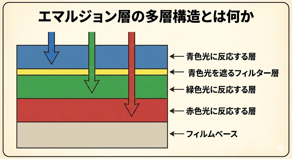 カラーのフィルムは、1枚のフィルムの中に、青・緑・赤の光をそれぞれ受け持つ感色層が縦方向に積み重なっています。上から順に見ると、おおまかには以下のような構造です。