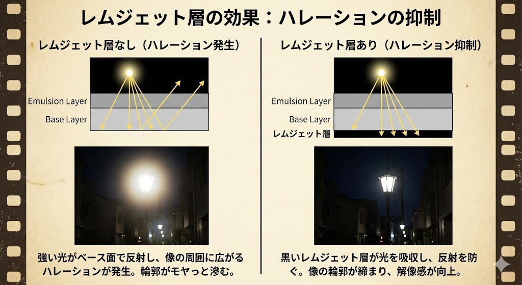 映画用のカラーネガでよく出てくるのが「レムジェット」です。これはフィルムの背面にある黒い層で、強い光がベース裏で反射して像がにじむハレーションを抑えたり、帯電防止として静電気由来のスタティックマークを減らしたり、搬送性を良くしたりします。