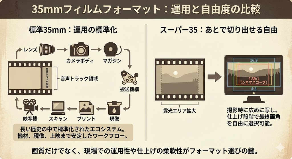 どれも派手ではありませんが、フィルム撮影ではかなり重要です。フィルム映画の仕組みと特徴を理解するというのは、見た目の話だけじゃなく、こうした裏側の動きまで含めて理解することなんだと思います。