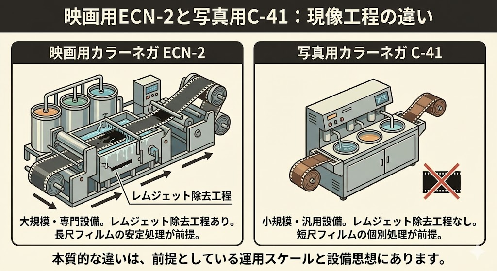 ECN-2は映画用フィルムを前提にした現像工程です。映画では、1本で数百メートル、作品全体では何千メートルものフィルムを扱います。そのためECN-2は、