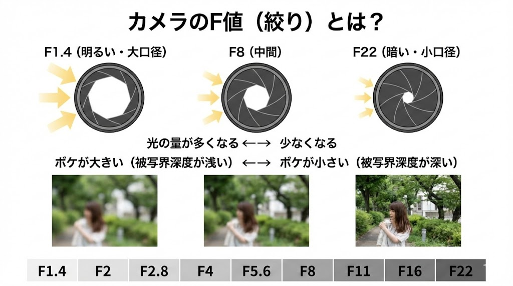 F値は入り口の光量を決める要素で、最終的な写りはセンサー性能と画像処理の総合力で決まる、と考えると判断しやすいです。