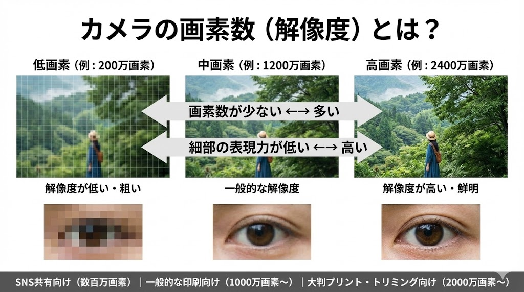 逆に言うと、高画素が活きるのは、明るい環境で風景の細部を残したいとか、後からトリミングしても破綻しにくいとか、そういう条件です。つまり、画素数は「常勝パラメータ」じゃなくて「得意な条件があるパラメータ」だと考えると納得しやすいです。