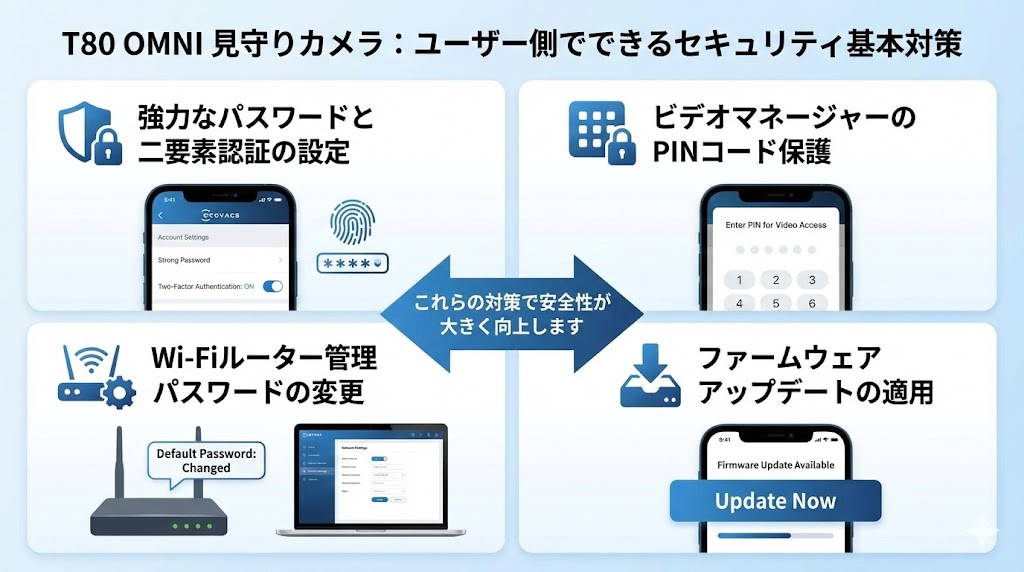 セキュリティ面については、「カメラ付き=危険」と一括りにしてしまうのはもったいない一方で、何も考えずに使うのもおすすめできません。T80 OMNIは、データ通信の暗号化や外部からの不正アクセス対策を意識した設計になっていますが、最終的な安全性はあなたの使い方で大きく変わります。