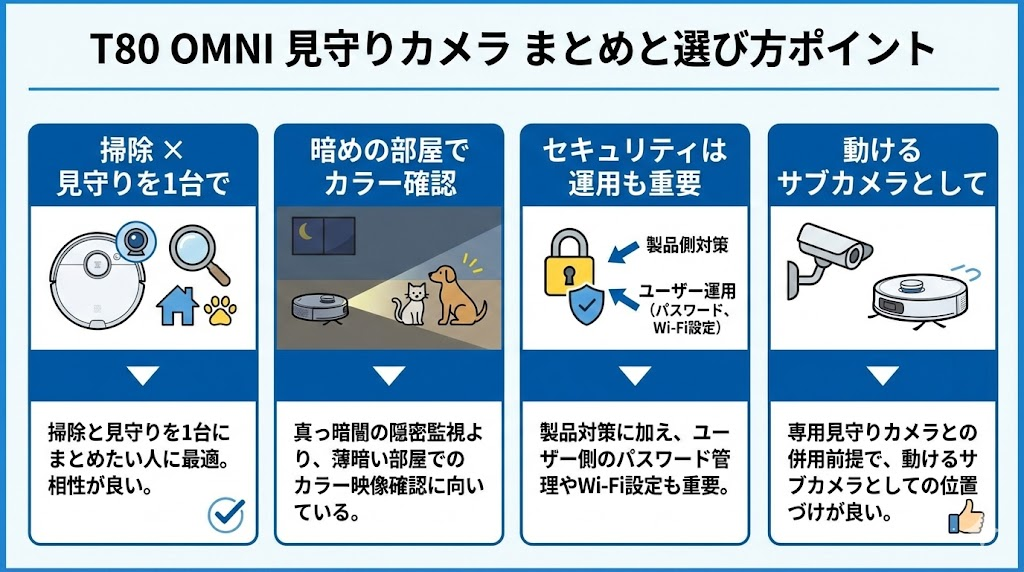 最後に、T80 OMNI見守りカメラを選ぶかどうか迷っているあなた向けに、要点をまとめておきます。