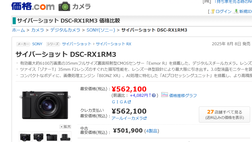 約538,000〜593,000円台 まで下がるケースも確認されています(出典:価格.com RX1R III 製品ページ )。