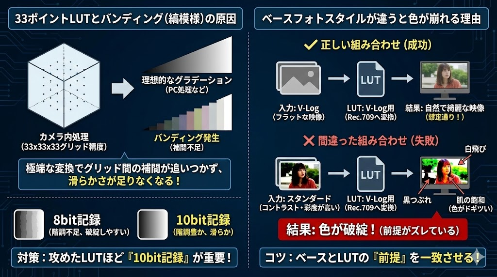 攻めたLUTほど10bit記録が重要です。8bitだと階調の余裕が少ないので、LUTの変換で一気に破綻しやすくなります。