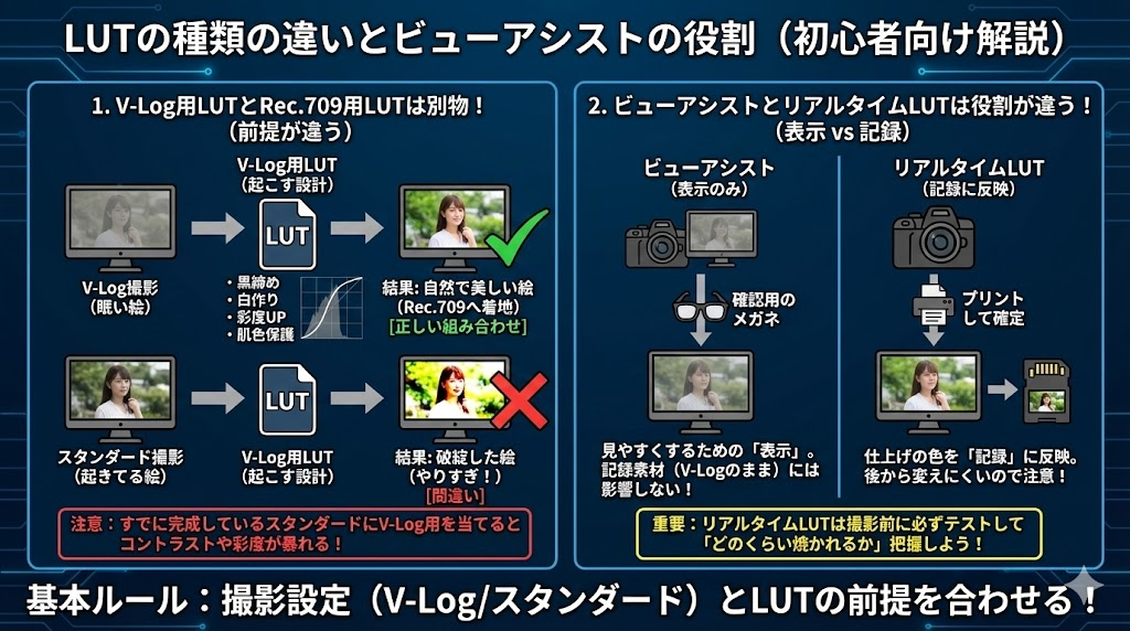 みたいな症状が出やすくなります。逆も同じで、Rec.709前提のLUTをV-Logに当てると「眠い」絵になりがちです。つまり、リアルタイムLUTを成功させるコツは、ベース(フォトスタイル)とLUTの想定を一致させることなんですよ。