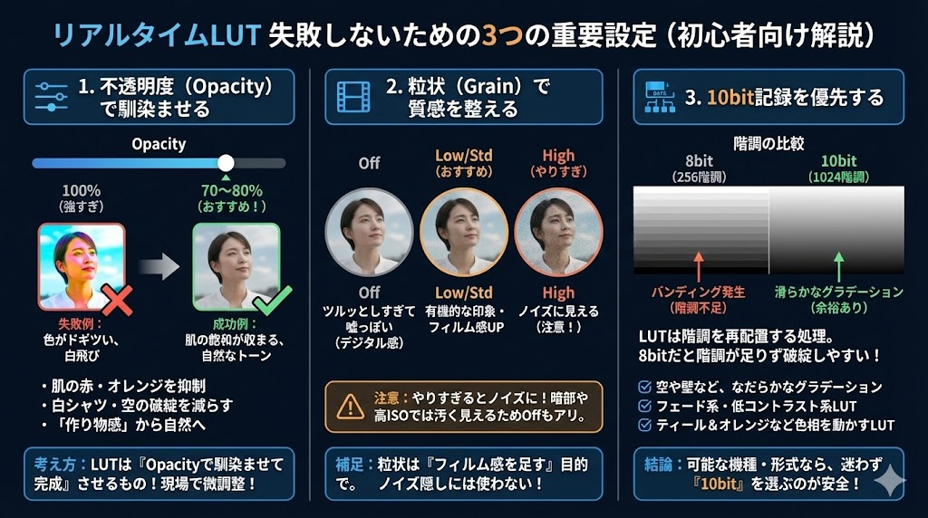 という下地ができます。その上でOpacity低めのクリエイティブLUTを足すと、撮って出しでも成立しやすい映像になります。リアルタイムLUT運用と、かなり相性がいい考え方です。