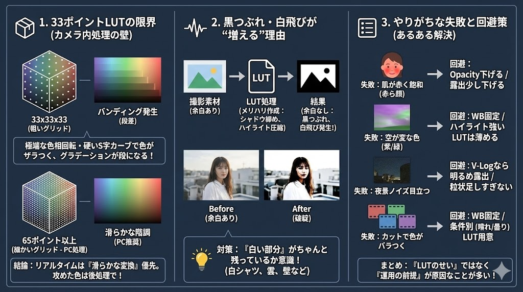 まずは「なぜリアルタイムLUTで色が崩れるのか」を先に潰しておきます。ここを押さえるだけで、LUT選びと運用が一気にラクになります。