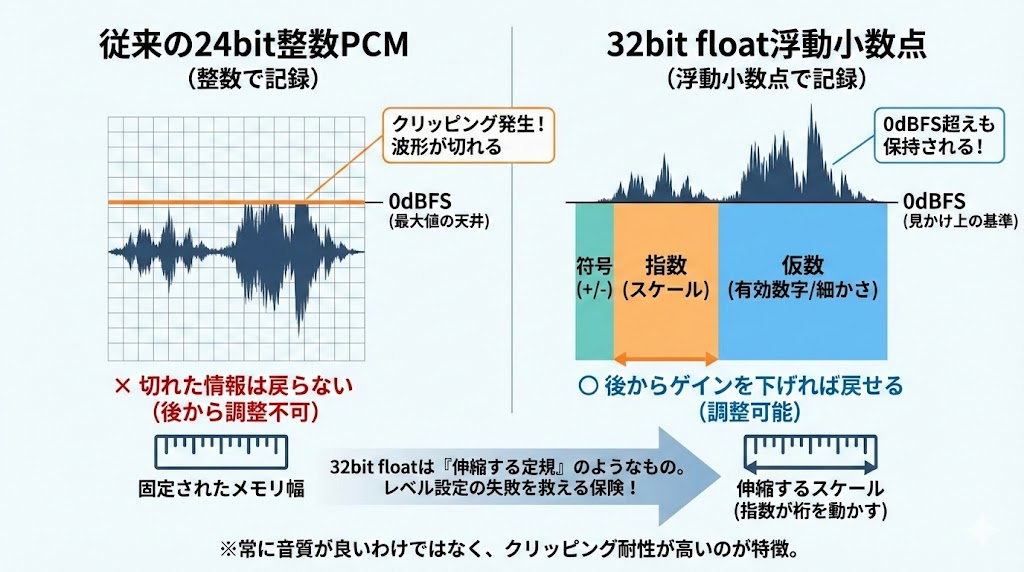 ポイント:32bit floatは「録音時に絶対に割れない」ではなく、デジタル天井で潰れにくく、後から適正レベルに戻せる可能性が高いという仕組みです