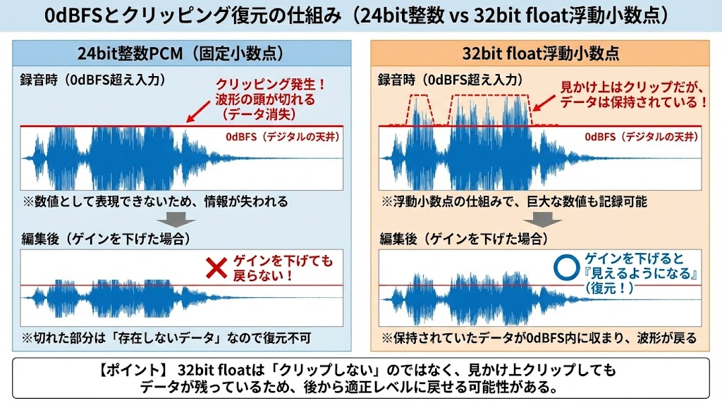 ポイント:32bit floatは「クリップしない」のではなく、クリップして見えてもデータが残っているケースがある、という理解が安全です。