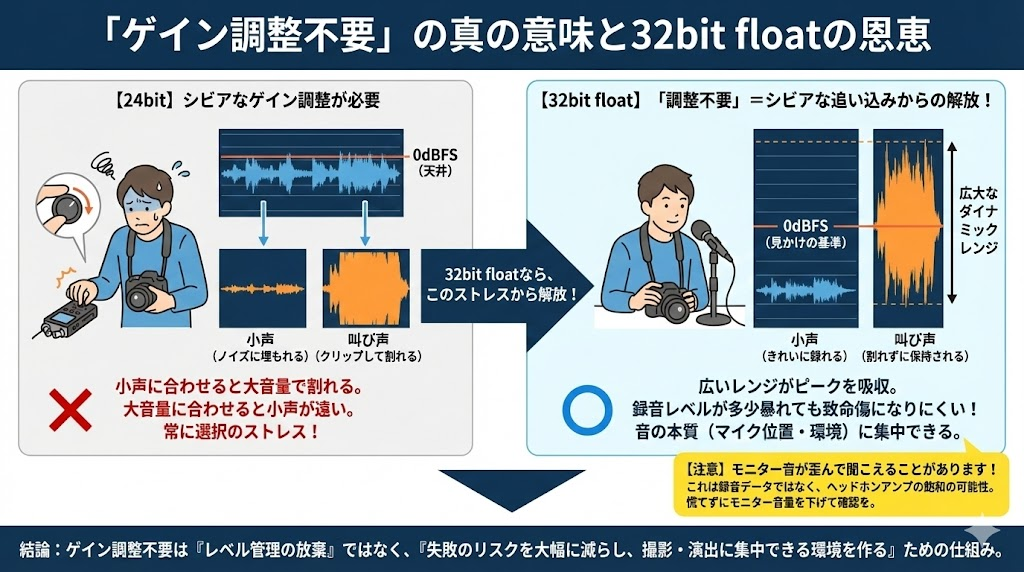 要するに、ゲイン調整不要は「作業が減る」けど、「考えるポイントが変わる」んですよ。ここを分かっていると、32bit floatがちゃんと武器になります。