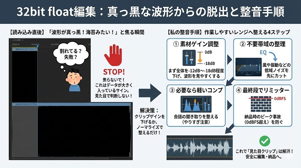 32bit float素材は“編集途中は自由”だけど“納品は現実の規格”です。最後に0dBFSを超えない形へ戻す、ここだけは絶対に省略しないほうがいいです。