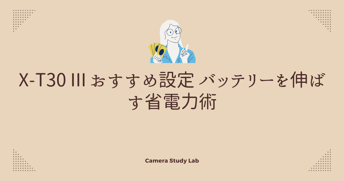 この章では、X-T30 IIIで「普段の撮影がラクになる」省電力の土台を作ります。ポイントは、ライブビュー・AF・表示の3つを必要な時だけ動かすこと。体感で効いてくる順に、私が実際に“効いた順”で整理していきます。