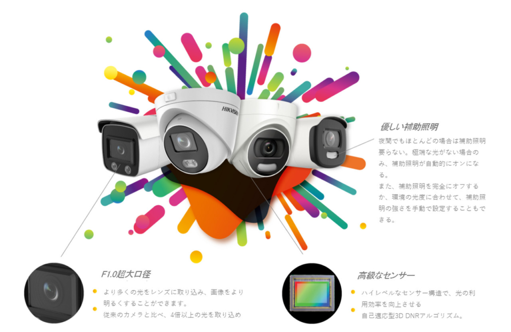 | ColorVu | 暗所でもカラーで見やすい | 夜間の店舗前・住宅外周 | 照明環境で差が出る |